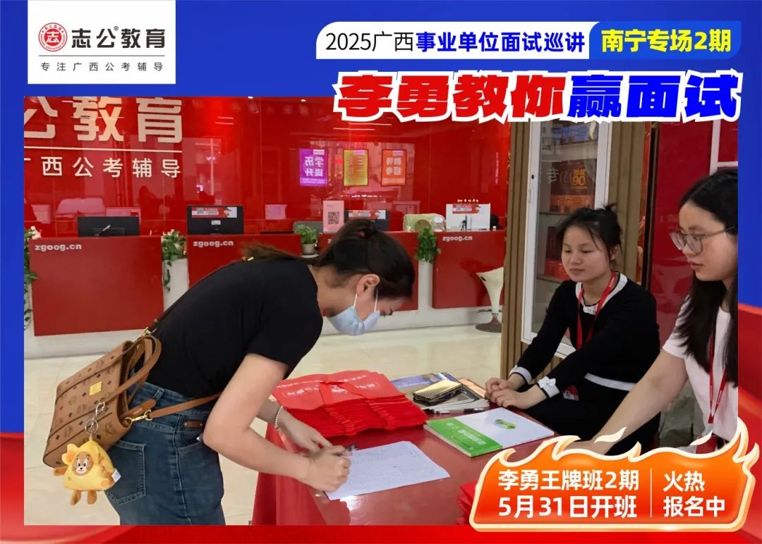 隨著2025廣西事業(yè)單位——李勇教你贏面試【南寧專場2期】線下巡講落幕,這場"面試攻堅戰(zhàn)",不僅點燃了備考熱情,更讓志公教育"幫助人才實現(xiàn)更高質(zhì)量的就業(yè)"的使命,在八桂大地結(jié)出更多碩果。