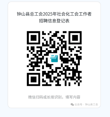 2.報(bào)名方式:采取網(wǎng)上報(bào)名方式報(bào)名。報(bào)名時(shí)間截止前,有意者請(qǐng)根據(jù)附件1填寫個(gè)人簡(jiǎn)歷,并用微信掃描下方二維碼打開小程序填寫《鐘山縣總工會(huì)2025年社會(huì)化工會(huì)工作者招聘信息登記表》,上傳個(gè)人簡(jiǎn)歷、身份證掃描件、學(xué)歷證書掃描件、學(xué)信網(wǎng)教育部學(xué)歷證書電子注冊(cè)備案表、榮譽(yù)證書掃描件、發(fā)表文章等佐證材料,逾期不再接收任何報(bào)送材料。