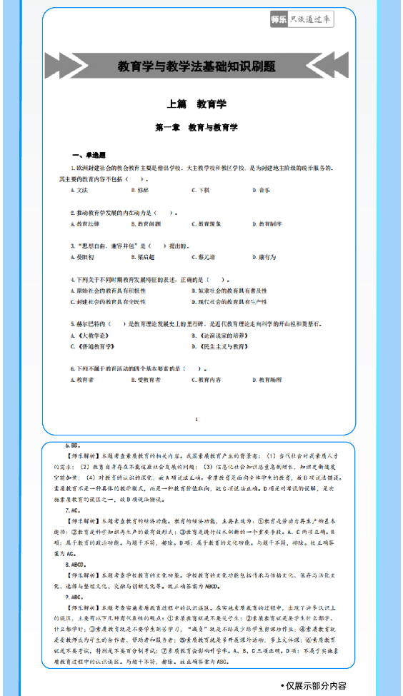 匹配考綱要求,精選50個(gè)核心考點(diǎn):銘師組團(tuán)精研,基于考綱收錄《教育學(xué)與教學(xué)法基礎(chǔ)知識(shí)》《教育心理學(xué)與德育工作基礎(chǔ)知識(shí)》核心考點(diǎn),重點(diǎn)突出,幫助考生學(xué)習(xí)記憶。