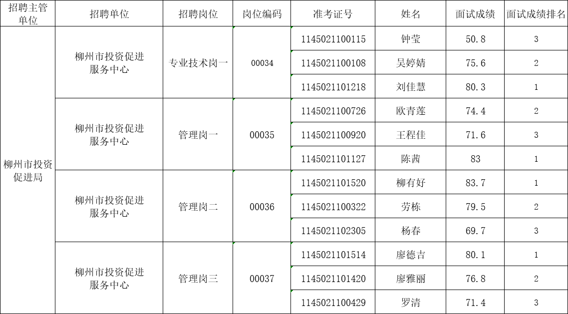 2025年柳州市投資促進(jìn)局所屬事業(yè)單位公開(kāi)招聘工作人員面試成績(jī)公示