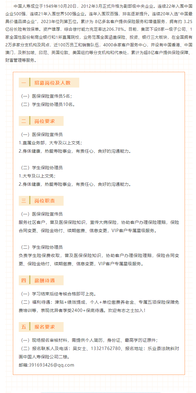 中國(guó)人壽保險(xiǎn)股份有限公司樂(lè)業(yè)支公司招募工作人員15名