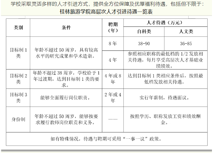 4.根據(jù)自治區(qū)政府文件要求,符合相應(yīng)條件者,學(xué)校積極配合申請(qǐng)廣西壯族自治區(qū)高層次人才認(rèn)定和各類人才項(xiàng)目,若入選可享受各類優(yōu)厚的人才待遇,詳情請(qǐng)登錄廣西高層次人才“一站式”服務(wù)平臺(tái)(http://www.gxrc.org/)查閱。首次來(lái)桂工作的35歲以下、具有博士學(xué)位的青年人才,可按照政策申領(lǐng)自治區(qū)青苗人才普惠性支持。如入選桂林市高層次人才,還可以享受桂林市高層次人才有關(guān)津貼、購(gòu)房補(bǔ)貼和個(gè)稅獎(jiǎng)勵(lì)等人才補(bǔ)助。詳見(jiàn)桂林市高層次人才一站式服務(wù)平臺(tái)(https://gcc.glrcw.com/)。