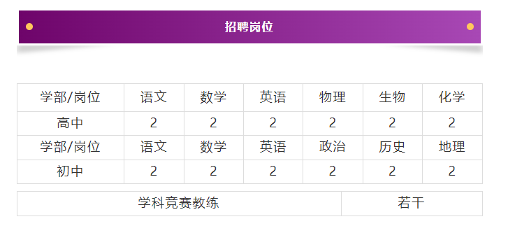 1.薪酬優(yōu)厚:青年教師8-10萬,骨干教師14-20萬,學科帶頭人20-30萬,學科競賽教練、教齡豐富且成績優(yōu)秀者面議。