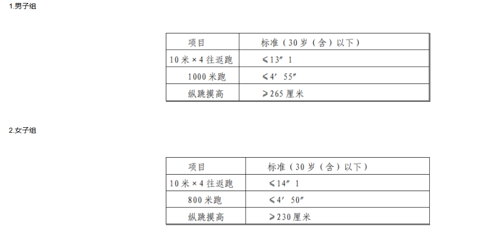 體能測(cè)評(píng)項(xiàng)目中,縱跳摸高的測(cè)試次數(shù)不超過3次,10米×4往返跑測(cè)評(píng)次數(shù)為2次,1000米/800米的測(cè)評(píng)次數(shù)均為1次。應(yīng)聘勤務(wù)崗位的人員,體能測(cè)評(píng)三項(xiàng)全部達(dá)標(biāo)的方為合格;應(yīng)聘文職崗位的人員,體能測(cè)評(píng)三項(xiàng)有兩項(xiàng)達(dá)標(biāo)的,視為合格。