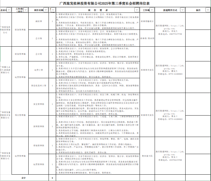 廣旅桂林投資公司有關崗位員工9名(詳見附件)。