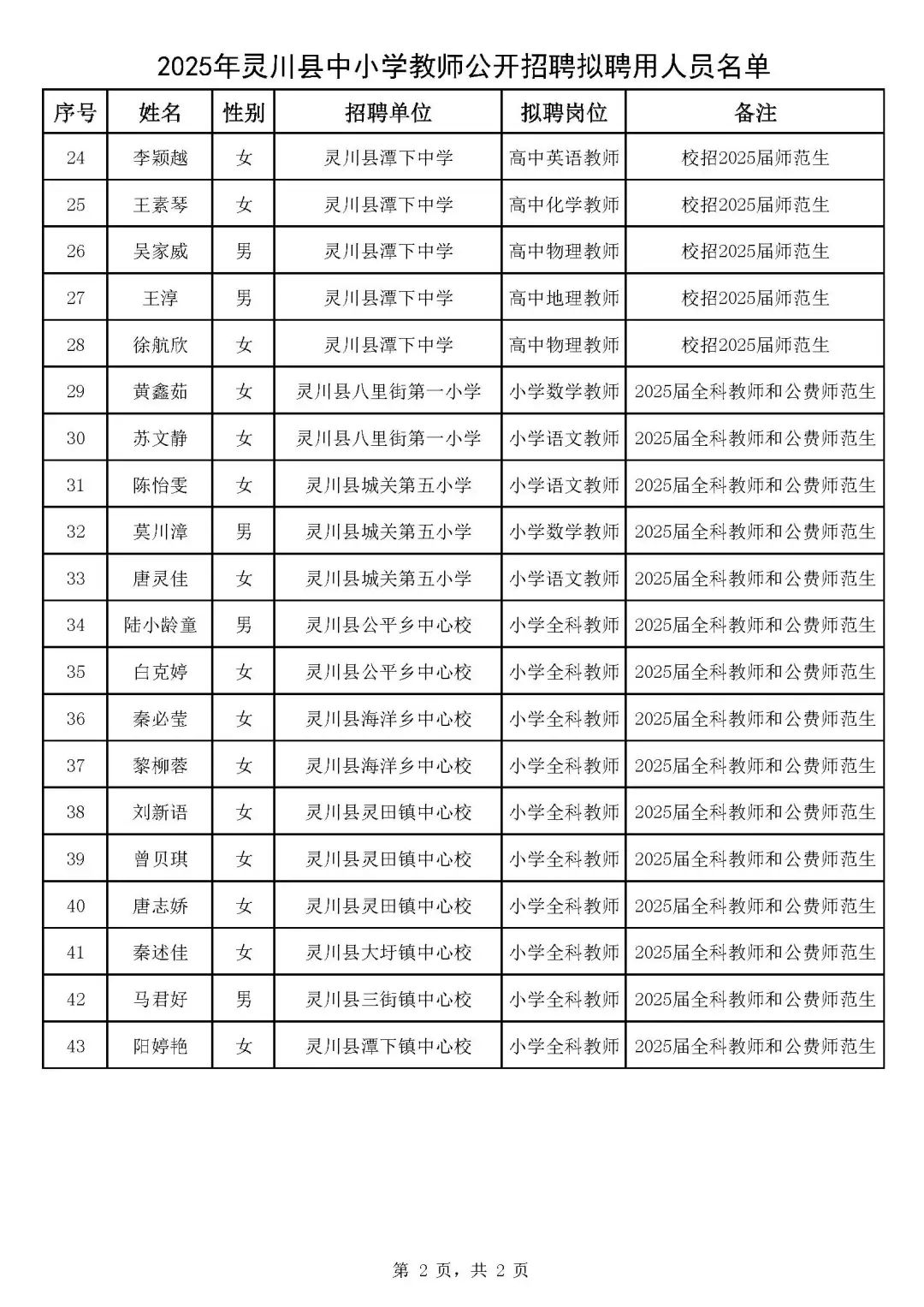 2025年靈川縣中小學(xué)教師公開招聘擬聘用人員名單公示