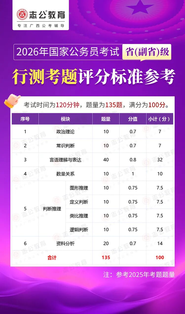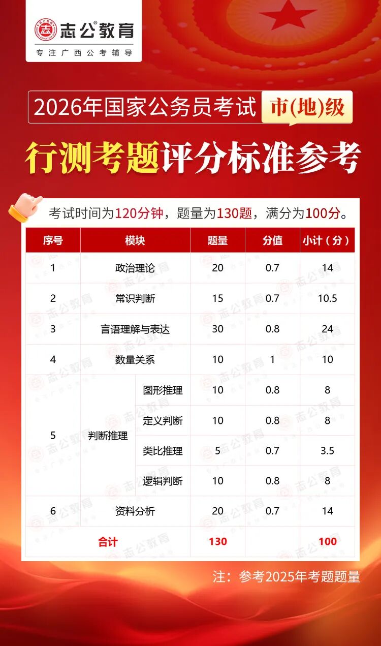 無論報名人數(shù)是否會增加,提升自身實力才是應對2026年國考的關鍵。行測作為國考公共科目筆試的核心模塊,不僅分值占比高(通常為 100 分),更是考生之間拉開分差的關鍵戰(zhàn)場。它并非單純考查知識儲備,而是通過言語理解、判斷推理、數(shù)量關系、資料分析、常識判斷、政治理論六大板塊,綜合評估考生的信息處理速度、邏輯思維能力、應急決策水平等綜合素質。