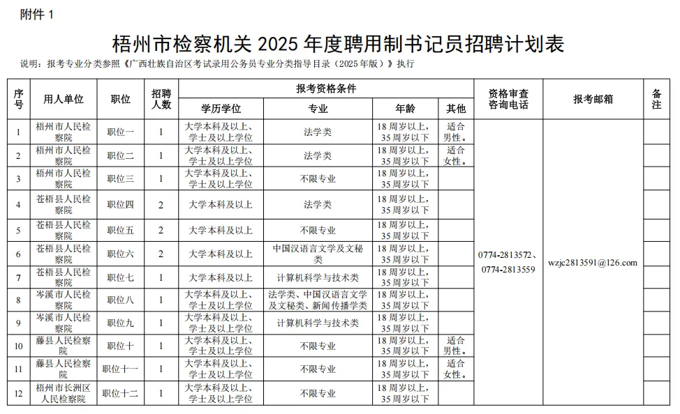詳見《梧州市檢察機關(guān)2025年度聘用制書記員招聘計劃表》(附件1)。