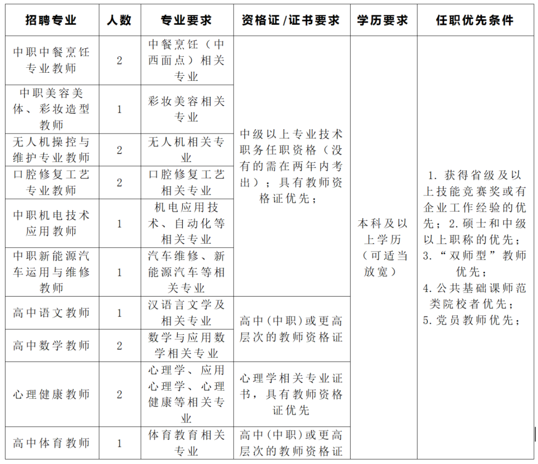 機(jī)電應(yīng)用技術(shù)、中餐烹飪、新能源汽車檢測與維修、平面設(shè)計、社會文化藝術(shù)、美發(fā)與形象設(shè)計專業(yè),各1人。